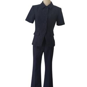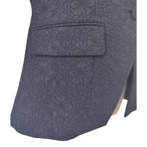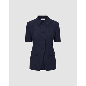 Impeccably tailored in a premium jacquard with an elegant navy tonal floral pattern, the Bodie is a structured jacket designed with an elongated, slim-fitting silhouette. Strong, padded shoulders and darting at the waistline create subtle shape, while front flap pockets, an angled cutaway hem, and matching covered buttons complete the look. Wear this textured blazer jacket with the coordinating Dell pants for a sleek matching set.
