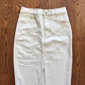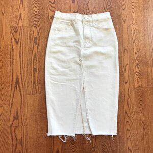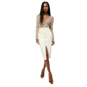 Women's Veronica Beard Breves Stretch Denim Midi Skirt in a size 0. A great denim skirt is a cornerstone of every wardrobe. The Breves is expertly tailored from premium stretch ecru denim, with a flattering high-waist midi silhouette, a front slit and classic 5-pocket styling. Dress it up or down or try it with a denim vest for a new take on double denim. Originally $268. Fast Same Day Shipping!