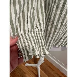 Color is Sage Green. 99/1 cotton/spandex. Ruffle collar. Smocked cuffs. Crinkle texture.