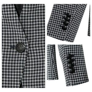 Stylish and chic houndstooth blazer and pants set. Features a classic black and white pattern. Perfect for professional or casual wear.