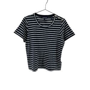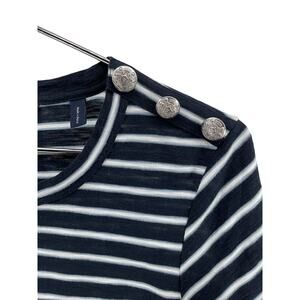 Veronica Beard 'Carla' Blue Cotton Stripe Crewneck T-Shirt Size L: crewneck short sleeves relaxed fit, a trio of crested buttons and classic stripes, measurements: 21 inch bust width x 24 inch length x 8 inch sleeve length.