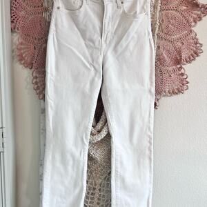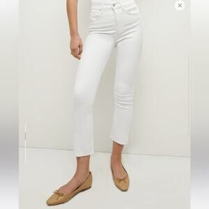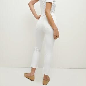 These Veronica Beard jeans feature a crisp white color and a chic cropped ankle length, offering a minimalist and timeless style. The clean, straight hem and slim fit make them a versatile addition to any wardrobe.