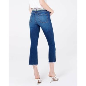 The Carolyn Baby Boot Jean features a 10" high-rise flared silhouette with an exposed button fly, grosgrain ribbon trim and frayed hems.