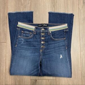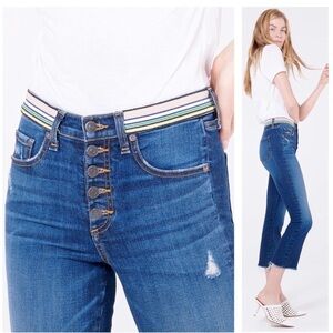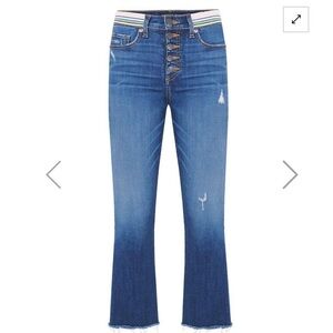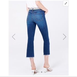 The Carolyn Baby Boot Jean features a 10" high-rise flared silhouette with an exposed button fly, grosgrain ribbon trim and frayed hems. We use the highest quality stretch denim which means our jeans have the most flattering fit and a quick recovery. The flared silhouette complements heels and flats alike.