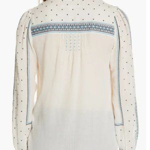 Intricate embroidery and a crinkled finish supply this silken blouse with free-spirited bohemian charm.