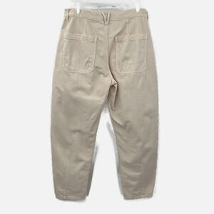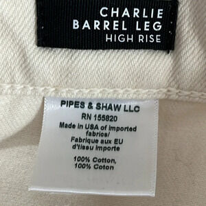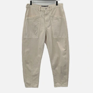 Veronica Beard Charlie High Rise Barrel Leg Jeans in Ecru - Size 31. Excellent, like new condition. These were new without tags but had lots of shelf dirt on them. I washed, hung to dry and steamed. Curved to taper along the ankles, the Charlie high-rise jeans are a structural update to the classic straight-leg. 100% cotton. Fitted at the waist, tapered cropped leg, oversized patch pockets front and back. Zip fly with button closure, high rise. Approximate measurements: 17" pit to pit, 12 1/2" rise, 26" inseam.