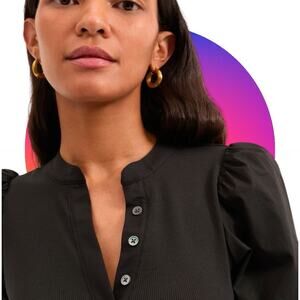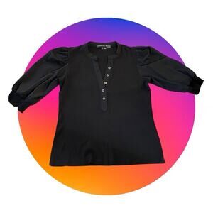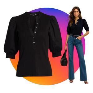 Veronica Beard Coralee Puff Sleeve Blouse Tshirt Top in black is a stylish and versatile piece perfect for party, casual, or business occasions. Made from a lightweight knit fabric blend of ribbed Pima cotton and spandex, this blouse features a Henley neckline, pullover closure, and 3/4 puff sleeves with button accents. With a designer touch from Veronica Beard, this blouse exudes a classic and chic look, making it a must-have addition to your wardrobe for the summer, fall, and spring seasons. Easy to care for with machine washable instructions, this blouse is a timeless and fashionable choice for any woman. Originally $198