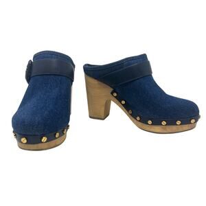Veronica Beard Dacey Denim Clogs Heels Studded Buckle Wood Blue Size 6