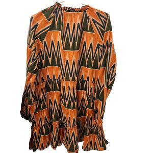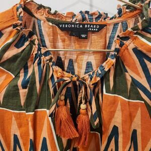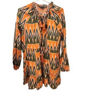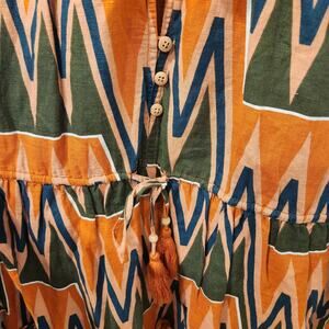 Geometric mixed prints cover this cotton mini dress, designed with boho tasseled trim.