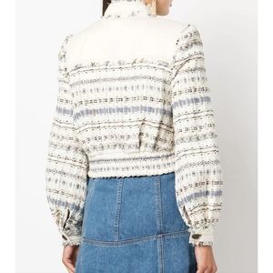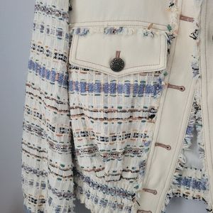Beautiful Darren tweed jacket from VERONICA BEARD featuring ecru, multicolour, cotton, collarless, button fastening, two chest flap pockets, shirred panel, long sleeves and buttoned cuffs.