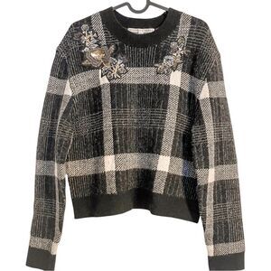 Features long sleeves, ribbed edges, crew neckline, pullover style, relaxed fit, plaid with embellished floral details
