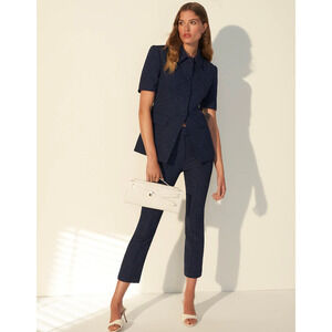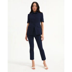 The classic slim tailored trouser, reimagined in navy floral jacquard. The Dell trouser pants feature a high-rise waist, streamlined silhouette, and a versatile cropped ankle, finished with a navy tonal pattern for understated texture. Pair these jacquard pants with the coordinating Bodie jacket for a chic spring set—the cropped length works well with flats and heels alike.