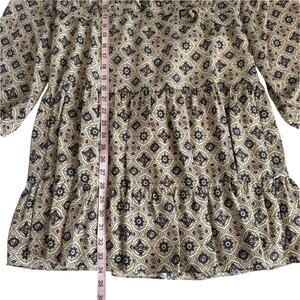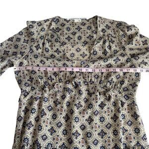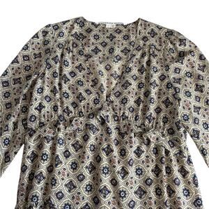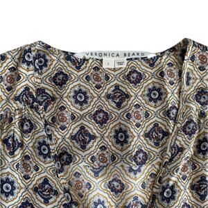 Features: Veronica Beard Delray Silk Crepe Mini Dress Printed Long Sleeve; all over medallion/mandala print in navy blue and neutral colors, v-neck, long sleeves, ruffle details, pullover style, 100% silk.