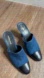Chic denim mules with black leather accents. Ideal for versatile styling.