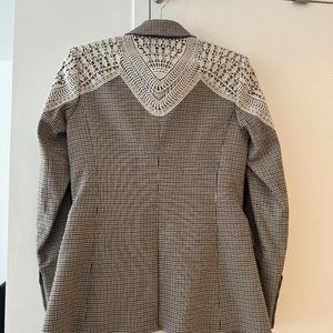 Beautiful grey plaid blazer with cream crochet lace detailing. Ability to add a dickey into the jacket and has a very tailored finish.