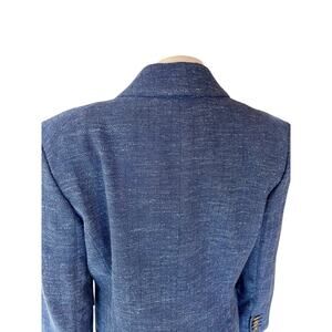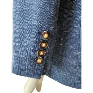68% Virgin Wool, 25% Cotton, 7% Linen. Peak lapel. Double-breasted design. Long sleeves with button cuffs. Single chest welt pocket. Side flap pockets. Dickey compatible. Lined. Professional dry-clean.