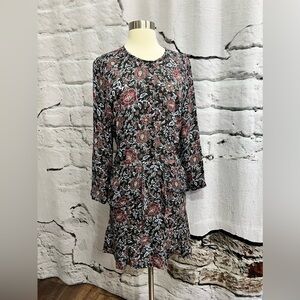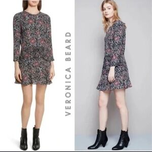 Veronica Beard Dropped Tie Waist 100% Silk Red Blue Black Ruffle Dress Sleeves