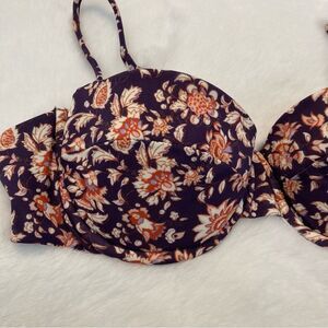 Veronica Beard Dyer bikini swim top. Ultramarine purple and red floral pattern. Padded and lined. Underwire. Sweetheart neckline. Adjustable straps.