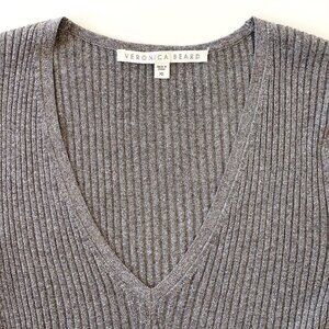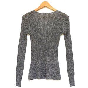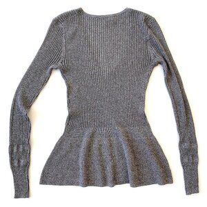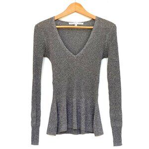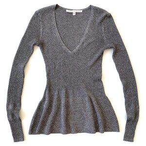 Veronica Beard Esmeralda Silver Metallic V-Neck Ribbed Peplum Sweater Top