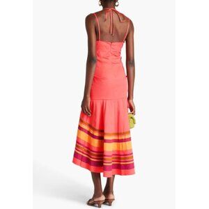 Veronica Beard 'Fitz' sleeveless midi-dress featuring a flattering ruched bodice and an asymmetric striped skirt.