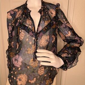 Elegant floral blouse with ruffle details and a flattering V-neck. Perfect for any occasion no size tag see measurements thank you