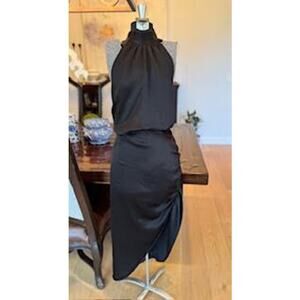 Veronica Beard Gabriella Black Silk Halter Top Asymmetrical Cocktail Dress Sz 16. Ruching on left side of skirt; Halter top ties at nape of neck with large bow. Side zipper. In good condition. Dry clean.