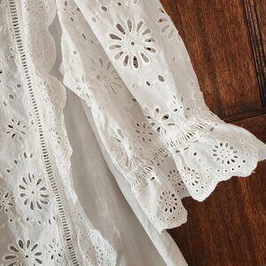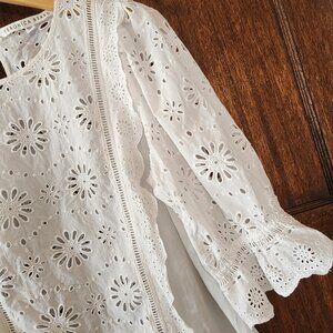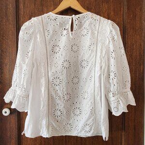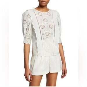 Stay your coolest and look your cutest in this eyelet-covered Veronica Beard white blouse. This top meshes well with a tidy skirt, or just your favorite jeans