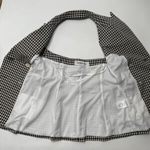 Chic gingham pattern. Double-breasted style. Halter neckline. Ideal for layering.