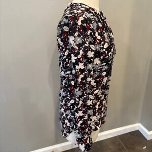 Fit/ features: Long Sleeves blouse with black, red, navy and white floral print; button front closures with covered buttons; pleated fabric detail on front.