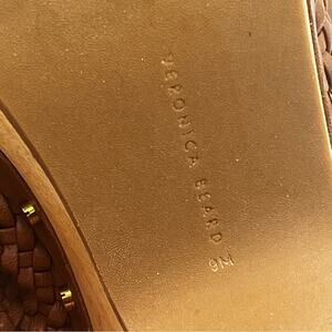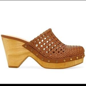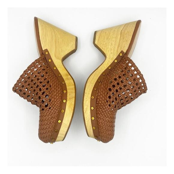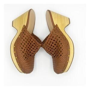 Veronica Beard Hardie Woven Leather & Wood Heeled Clogs Cognac Brown 9
