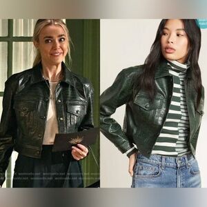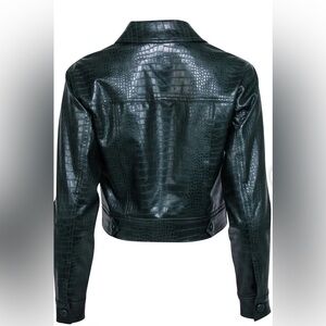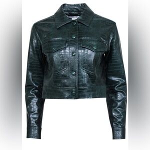 Add a fierce and fashionable layer to your looks with the Veronica Beard Hendrix Jacket. Made from croc-embossed faux leather fabric in a dark green hue, this sleek and stylish cropped jacket is a must-have for every fashionista's wild wardrobe. Perfect pairing with black jeans and leather booties, this jacket lends a playful and chic touch to any outfit.