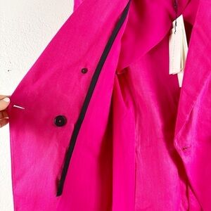 Double breasted button details, solid, peak lapel collar, long sleeve with button cuffs. Interior zipper for Dickey attachment. Linen blend. Lined. Fuchsia hot pink. Casual, work, dressy, professional, career, suit, tailored.