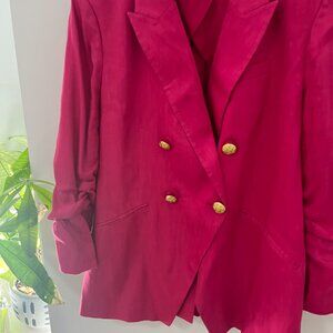 Veronica Beard Hot Pink Linen Blazer Size 14. Hot pink color. Large gold buttons. Ruched 3/4 sleeves. Front pockets that are not functional. Collared. Linen blend. Lightweight jacket.