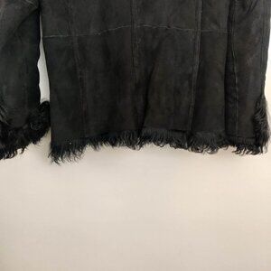 Black suede double-breasted blazer jacket with notched lapels, shearling trim, dual flap pockets at waist, tonal stitching throughout and & button closures at front.