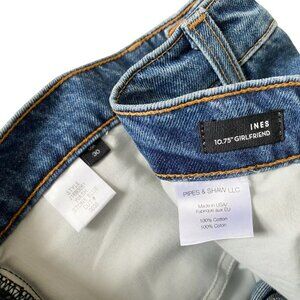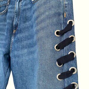 The Ines is a cropped length straight leg jean with a relaxed girlfriend fit. This pair features edgy silver grommet studded lace up sides with black grosgain ribbon. Pair these with a white tee, sneakers and minimalist accessories for an easy casual look. Or tuck in a black silk top and pair with heels for date night. 100% cotton. Size 30.