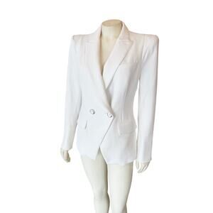 In a lightweight transitional suiting, the Thaddeus jacket takes you from season to season with ease. Classic tailoring with a double-breasted design gives this crisp white style its timeless appeal. Double-breasted design with single-button closure. Boxy/padded Shoulder. Compatible with all Veronica Beard Dickeys.