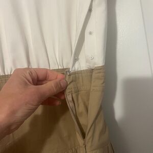 Dress has zip closure with hook and eye on skirt and 3 snaps on t-shirt