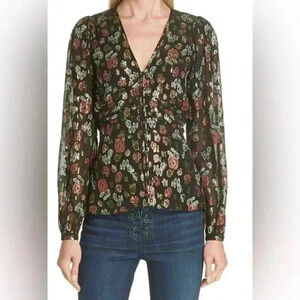 Keywords: Veronica Beard blouse, floral silk top, jacquard blouse, metallic floral blouse, Veronica Beard Joyce, silk blend shirt, designer blouse, size XS top