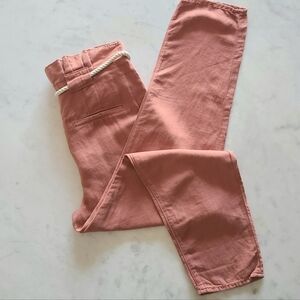 The Veronica Beard Karter crop pants are crafted from a breezy linen and cotton blend. They have a relaxed silhouette with pleated hip details, side pockets, faux welt pockets at back, and a natural rope belt. Color is 'mocha' but resembles more of antique rose.