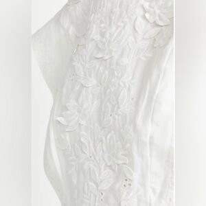 A minidress with intricately detailed floral embroidery and subtle eyelet accents.