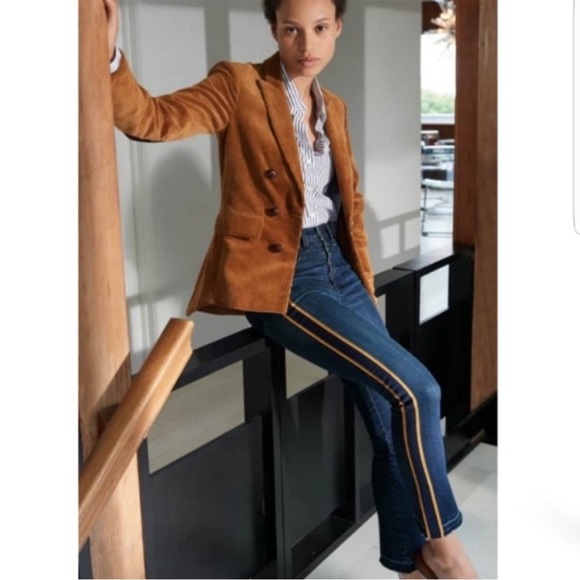 Vintage inspired dark vintage wash high rise high waist exposed button fly raw hem gold green ribbon tuxedo stripes detail along sides