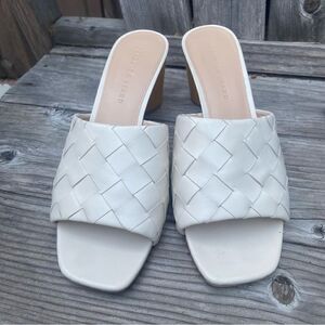 A teardrop-shaped wooden heel and woven leather upper adds a vintage-inspired charm to these mules.
