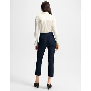 The essential kick-flare trouser. Expertly tailored from premium navy stretch cotton, the Kimra pant features a clean, flat front for easy styling and a slim, slightly flared leg for a streamlined look. A cropped hem finishes the look. A polished and versatile staple, it pairs well with tailored jackets and oversized sweaters alike.