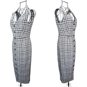 Refined and timeless, this tailored midi dress blends classic plaid with clean, modern lines. The sleeveless cut, flattering V-neck, and decorative button-down front evoke quiet sophistication, while the fitted waist and functional hem buttons add subtle structure and movement. Equally polished layered or worn alone, this versatile piece transitions with ease from office hours to evening plans. A true staple for the modern minimalist wardrobe.