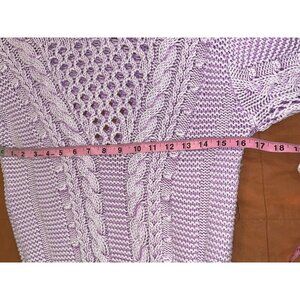 Crafted from a soft blend of cotton and acrylic, this lilac cable knit sweater offers a stylish and cozy look. The intricate open-weave pattern adds a unique touch to any outfit.