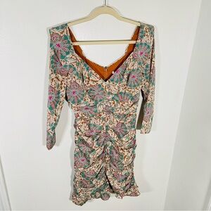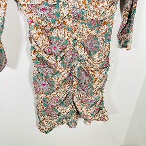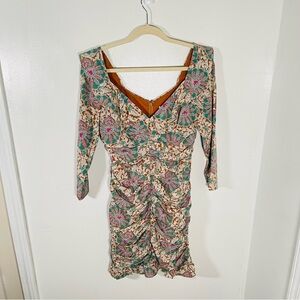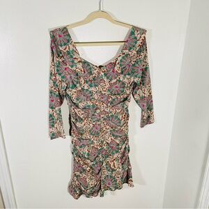 Color & Detail: Green and beige floral print; ruched detailing; mini length