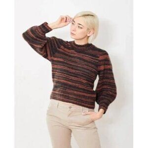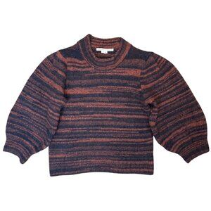 Made of high-quality merino wool blend, this Veronica Beard Lumina crew neck pullover cropped sweater space-dyed stripes in orange and black/brown hues. It features 3/4 puffy blouson balloon sleeves for a touch of flare. Perfect for any occasion, whether it's a casual night out or a party.