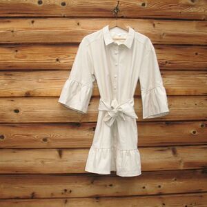 Faux leather dress with ruffle hem and three quarter length bell sleeves