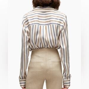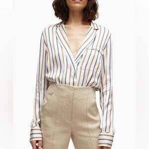 sand / blue/ tan Lusanne Striped Notched Lapel Popover L/S Blouse from Veronica Beard. satin twill fabrication with single chest, split hem. 100% viscose. EUC - no flaws.