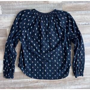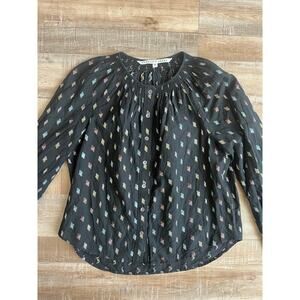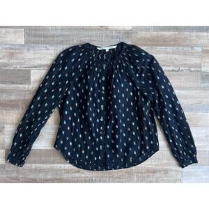 Veronica Beard lightweight button-down blouse with a metallic print. Long sleeves with button cuff.